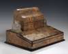 brass bound, the surmount with stationary box, the hinged serpentine lid enclosing a fitted interior flanked by ink bottles (damages), the sloping fall, opening to reveal a velvet surface with leather lined well below, fitted with pigeonholes