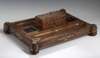 of rectangular outline with central casket for stamps, enclosed by two opposed and dished pen trays, the whole raised on turned feet