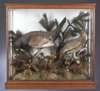 one male, one female, each perched on pine branches in a naturalistic setting and enclosed within an oak framed and glazed case, early 20th century