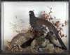 each perched in a naturalistic setting and enclosed within an ebonised glazed case, bears labels to the back "Capercailzies EJF Baledmund, 1920" and taxidermist label "P. D. Murdoch, South Street, Perth"