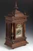 the twin train fusee movement with arched brass dial, the silvered chapter ring with Roman chapters and subsidiary fast/slow dial to the arch, the domed top with finial surmount above blind fretwork frieze and glazed door flanked by columns, raised on moulded base with turned feet