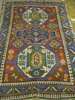 the red field with central stepped indigo medallion flanked by two octagonal medallions, within blue serrated leaf and glass border between ivory skittle stripes