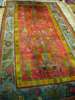 the red field with two opposed vases of flowers and butterflies, within blue foliate border between yellow and pink stripes
