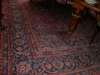 the red field with central blue medallion suspending pendants, similar spandrels, within an indigo scrolling vine and palmette border between stripes
