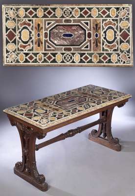 on later oak base, the rectangular top with moulded edge and central tablet, inlaid with strapwork panelled decoration in specimen marbles, raised on an early 19th century base with moulded scroll supports, with leaf carved brackets and husk pendants linked by a turned stretcher and raised on plinth bases