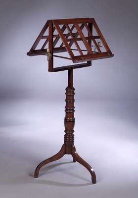 the opposed hinged and sloping falls with applied rests supported on a rectangular frame with two scrolling brass candlebranches to the sides, the whole raised above an adjustable support with ring turned column on tripod base with curved tapered legs, spade feet