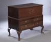 the rectangular hinged top with moulded edge above plain sides, the base section with arrangement of two short and one long crossbanded drawer raised on cabriole legs with pointed pad feet