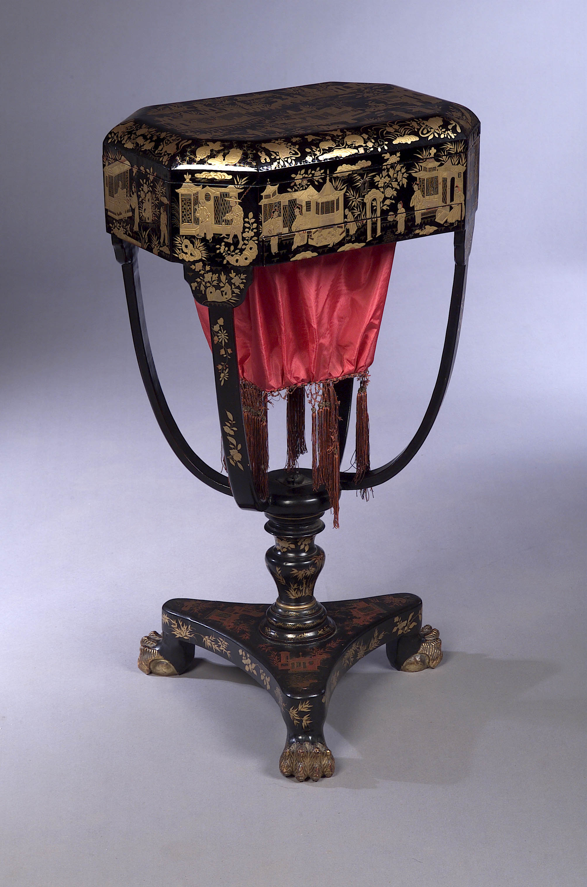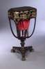 the octagonal top, with hinged lid enclosing fitted interior above sliding silk wool bin raised on four curved supports and turned pedestal on concave triform base and carved paw feet