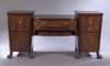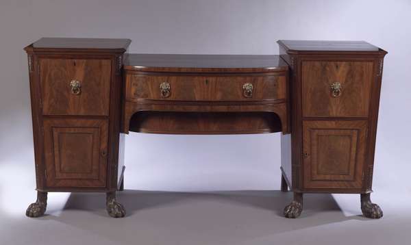stamped H. Mawer and Stephenson, London, with central semi-bowed top above a single drawer and arched drawer below, flanked by two tapering pedestals, each with canted and moulded top above deep cellar drawer and door with panelled cupboard door below, enclosed by reeded and canted angles and raised above carved hairy paw feet
