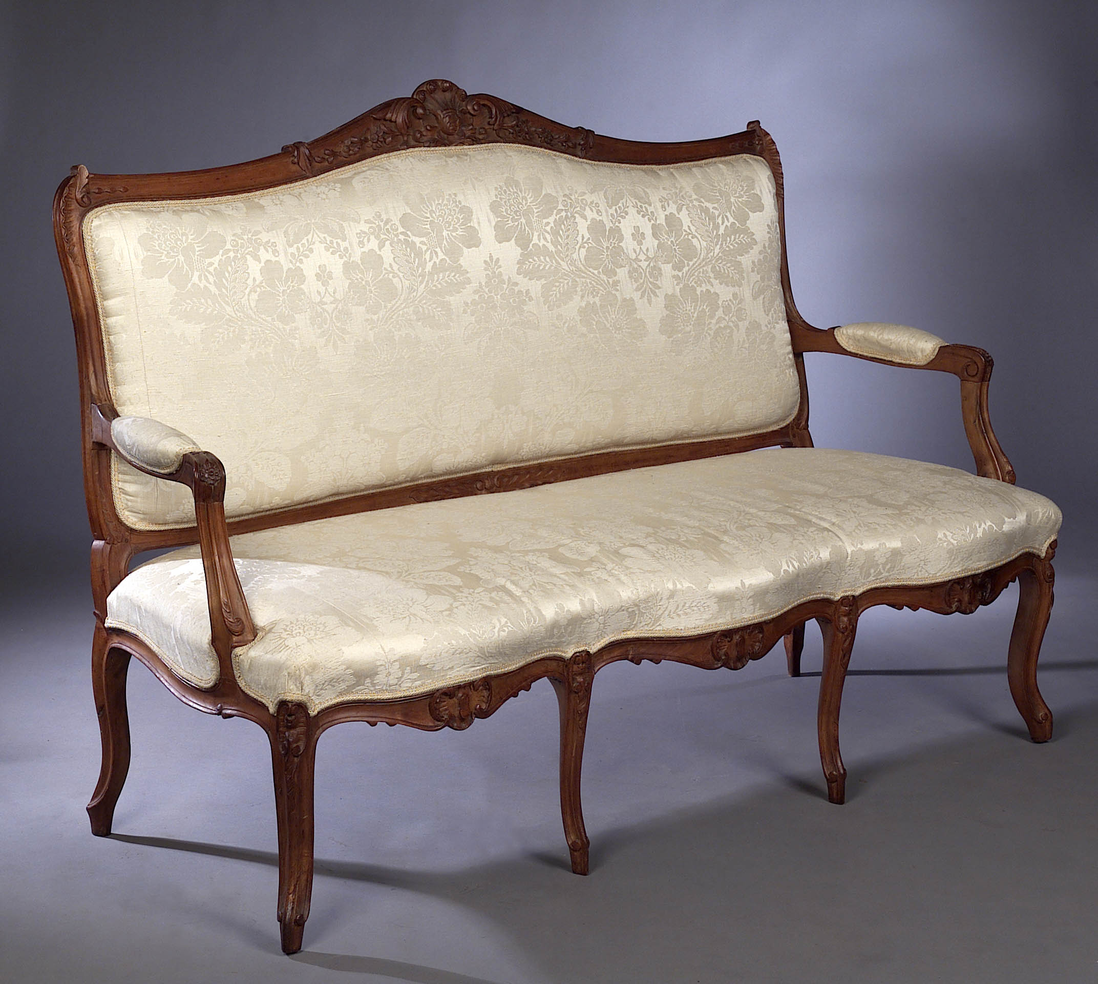 in the Louis XV style, upholstered in cream silk damask, the serpentine rectangular back with leaf scroll and floral-carved and moulded frame, above open arms with padded rests and carved and moulded upright, the double serpentine upholstered seat raised above a carved and moulded apron and raised on moulded cabriole legs with scroll toes
