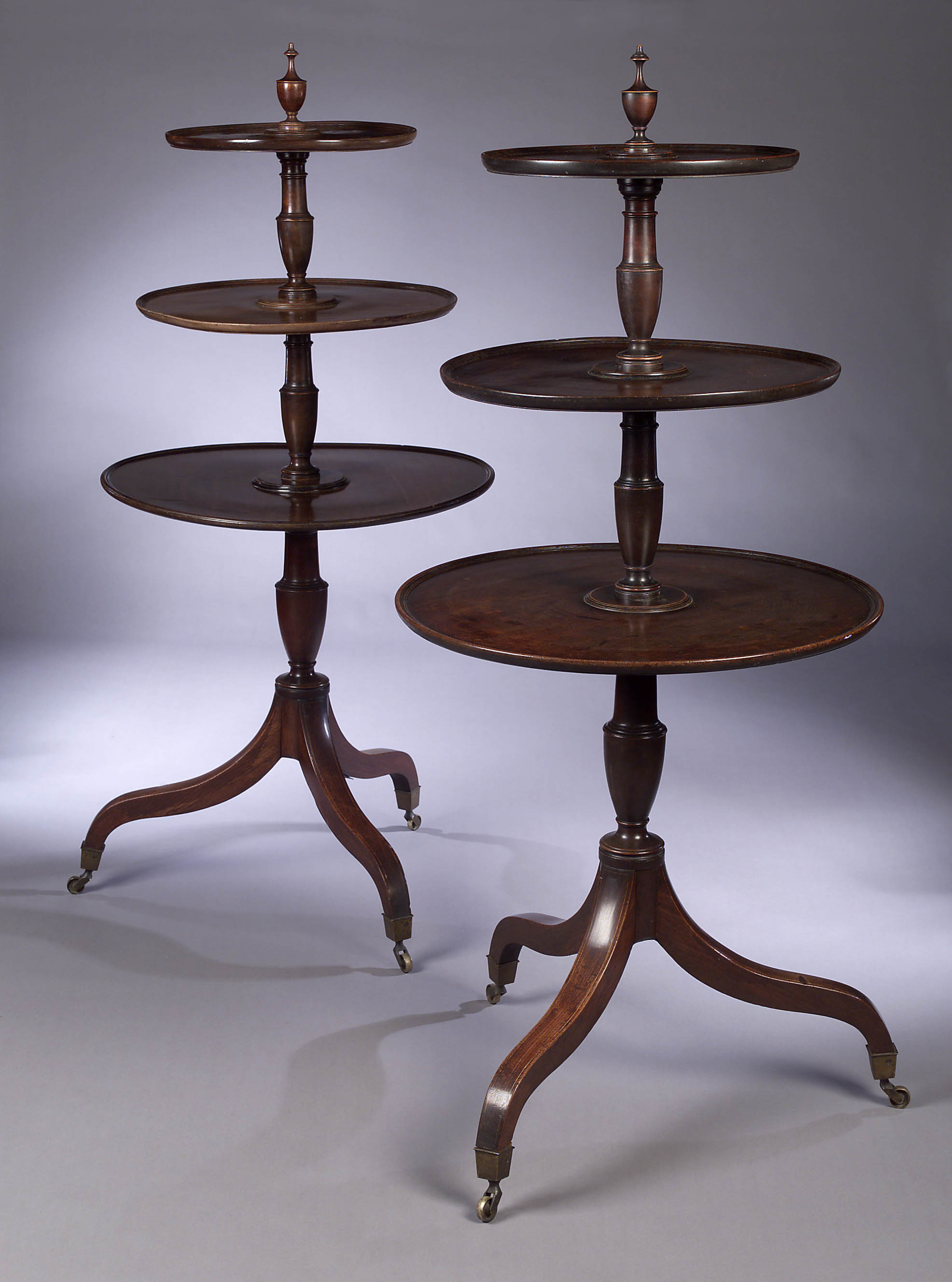 each surmounted by a turned urn finial, above three circular and graduating tiers, with moulded rim supported by turned urn uprights, the tripod base with square section curved legs with boxwood stringing, each terminating in brass caps and castors (2)