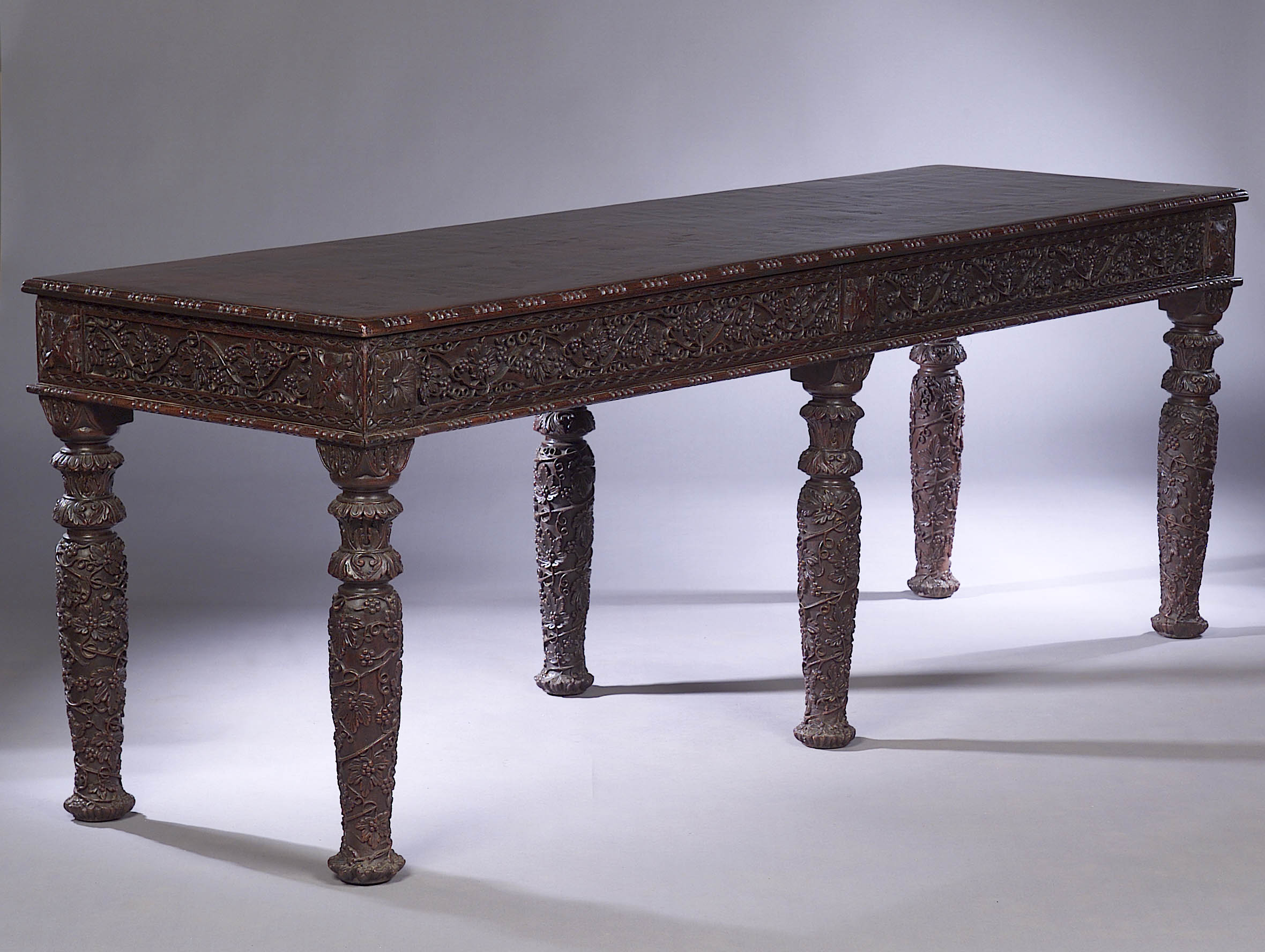 the long rectangular top with beaded edge raised above profusely carved frieze with vine panels, on six corresponding turned tapering baluster legs