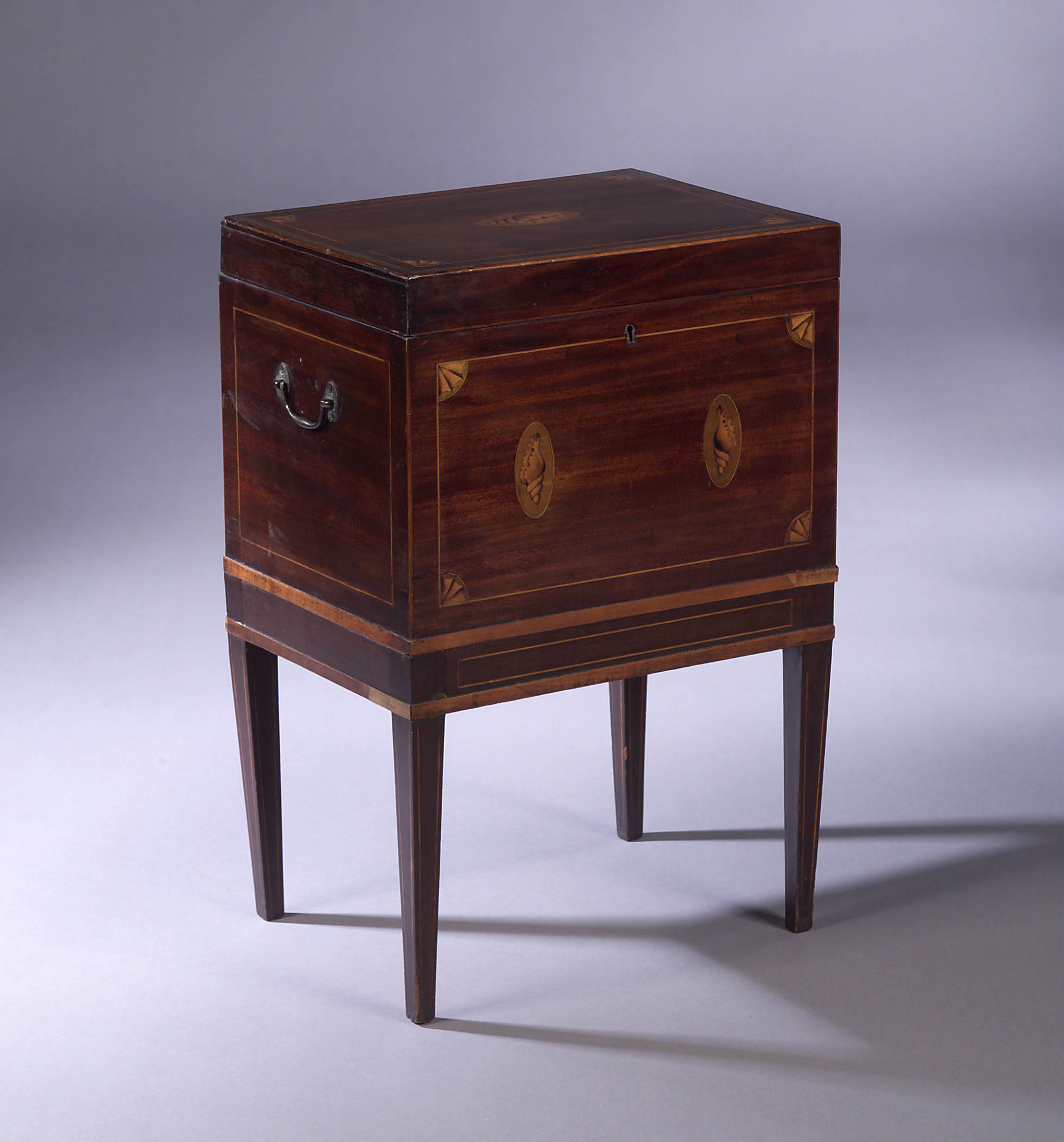 the rectangular hinged lid with boxwood stringing and chequer banding inlaid with fan spandrels and central shell patera, the front similarly inlaid, the whole raised on square tapering legs with boxwood panels, brass side carrying handles