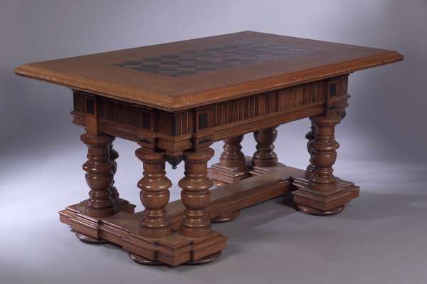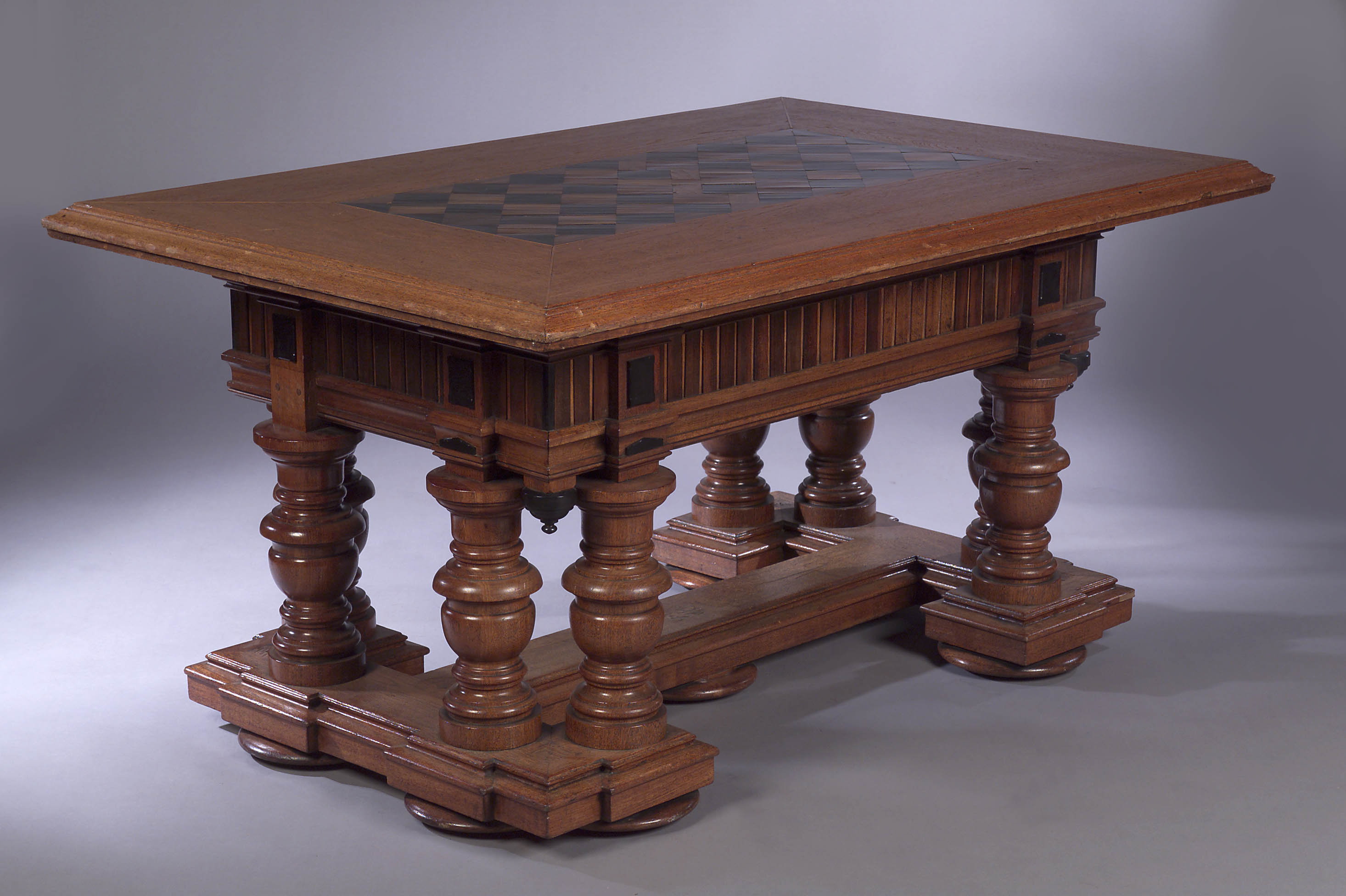 the rectangular moulded top inlaid with a chequer parquetry panel in coromandel and ebony, above a moulded frieze applied with coromandel tablets, raised on eight boldly turned supports and stepped plinth base linked by stretcher on flattened disc feet