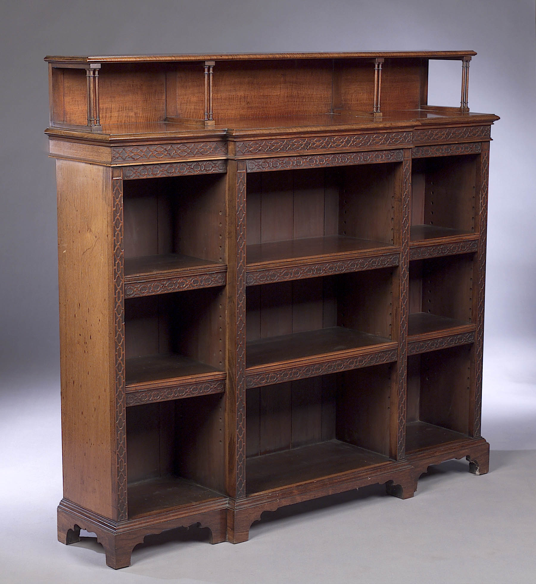 the breakfront rectangular top with moulded edge surmounted by open stage back (brass rail lacking), the base with blind fretwork decoration and adjustable shelves with corresponding dust flaps, on open plinth base