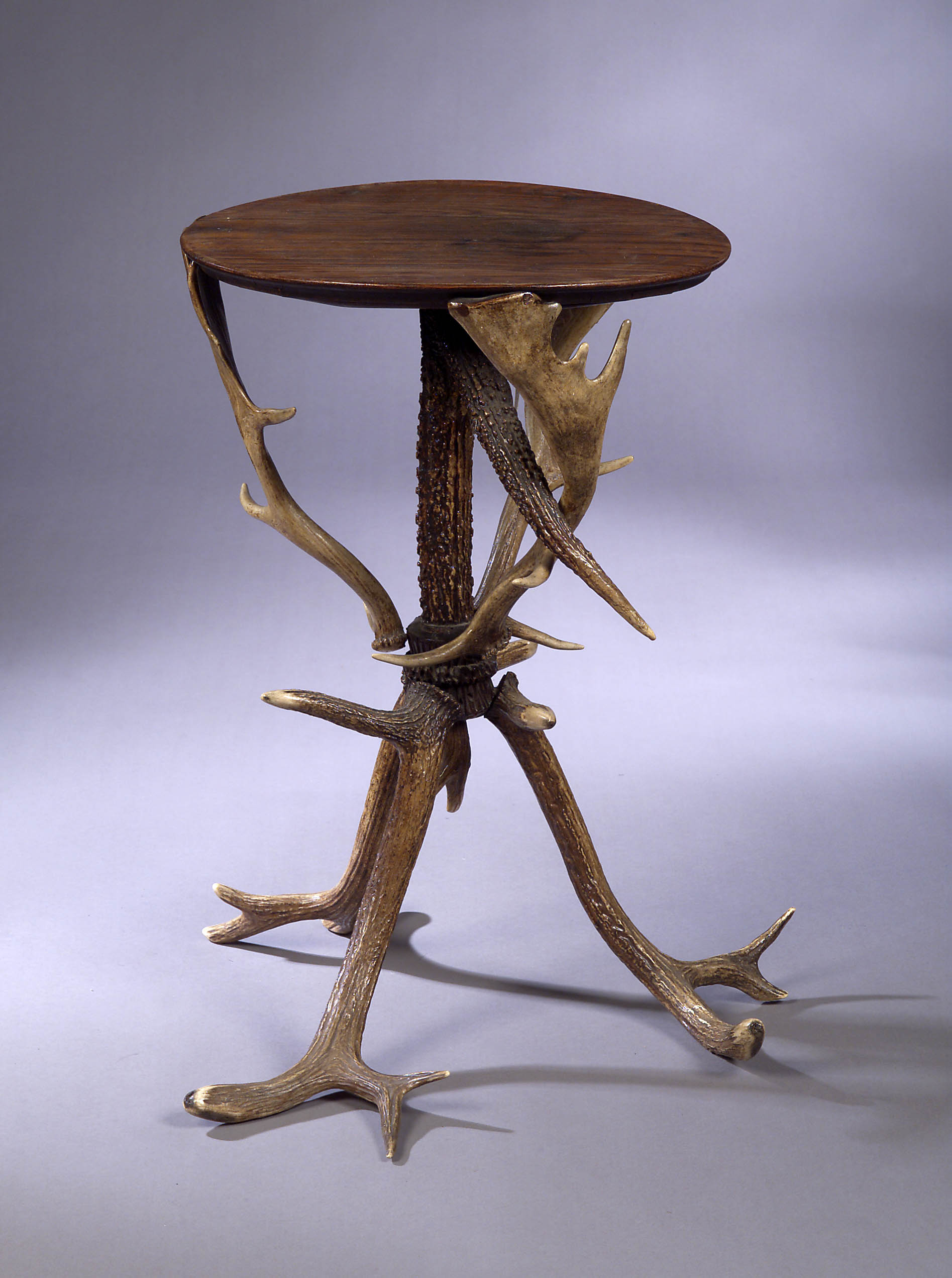 the circular ash top above central antler column with three antler supports raised on a tripod base