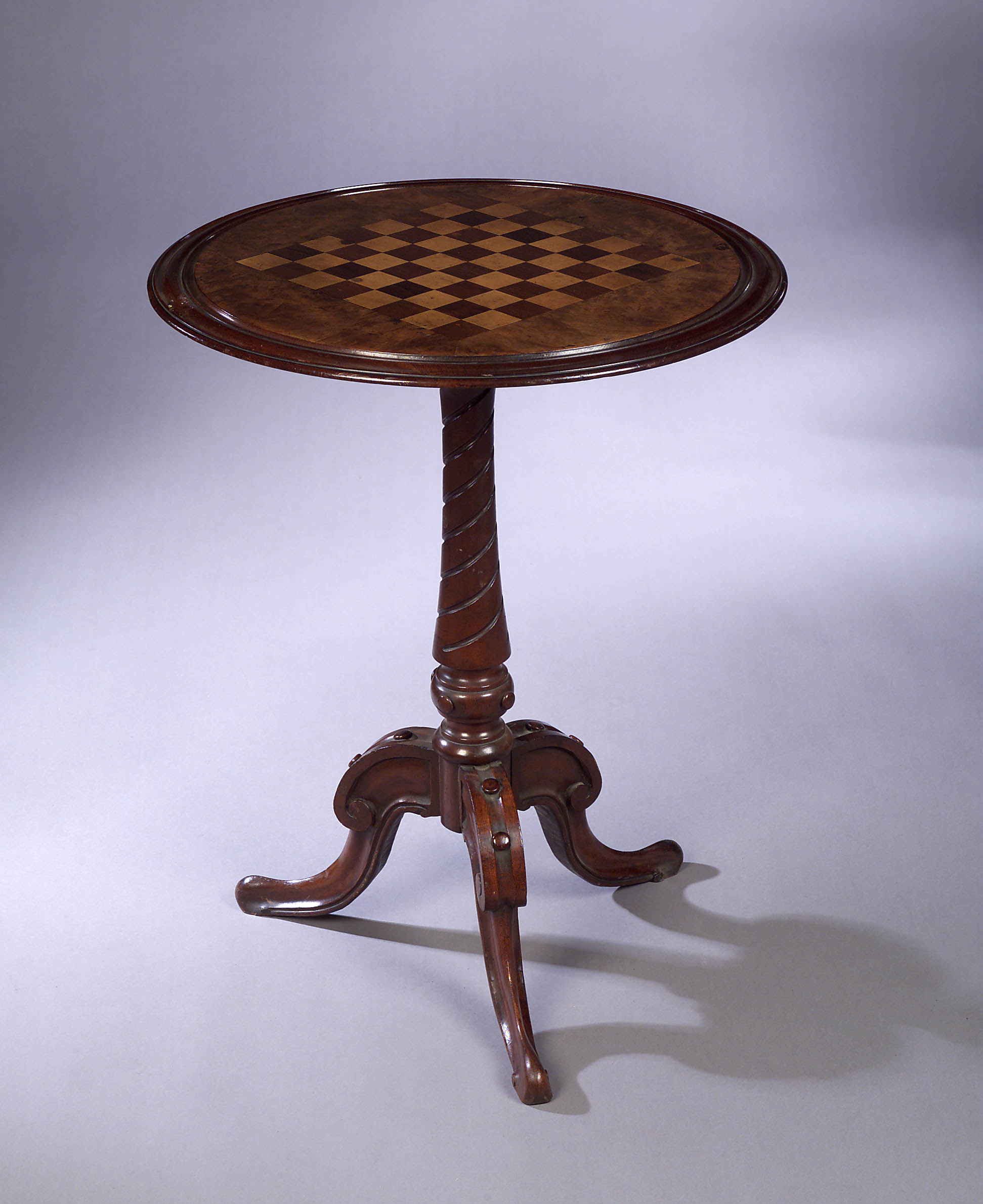 the circular top with moulded rim inset with central chequer board and raised on a turned tapering column with spiral fluting, the moulded sabre legs with applied disc decoration
