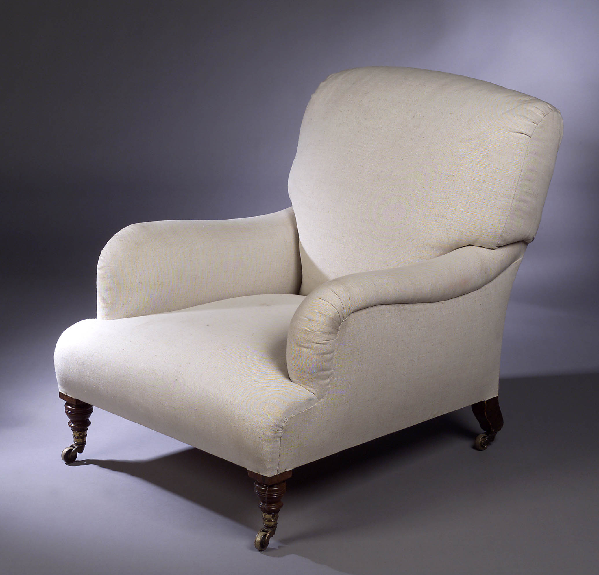 covered in a cream linen material, the rounded back above curved arms and deep seat, raised on turned and tapered front legs terminating in brass caps and castors, stamped to the rear leg 'Howard and Sons, Berner Street 16667 7767'