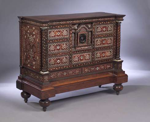 the rectangular parquetry top with projecting corners above arrangement of seven drawers around a central drawer with tabernacle front centred by a convex mirror, two further drawers below, flanked by freestanding columns, on later moulded plinth base and turned feet