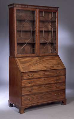 the moulded fluted cornice above twin astragal glazed doors enclosing adjustable shelves above a sloping fall enclosing fitted interior and four long graduated drawers on bracket feet