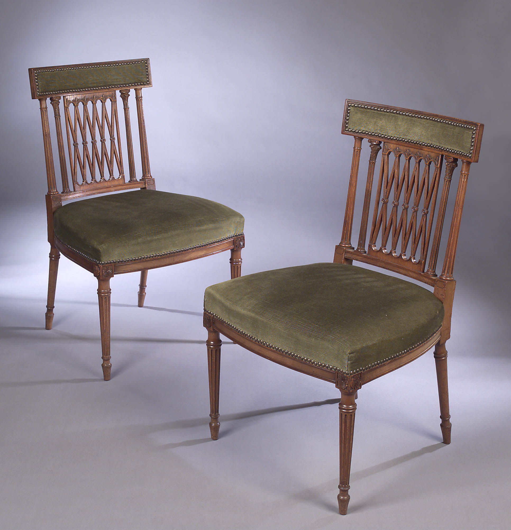 each with slightly curved top rails with padded upholstered panels above carved and pierced latticed splat flanked by fluted Corinthian columns and fluted uprights, the stuffover seats raised above panelled rails, turned and fluted front legs terminating in toupie feet (10)