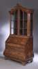 the arched and moulded cornice with central C-scroll and rosette carved cartouche above twin astragal glazed doors enclosing shelves, the sloping fall opening to reveal an interior fitted with drawers and pigeonholes with a well below and inset writing surface, above bombe chest of two short and two long drawers, raised on bracket feet