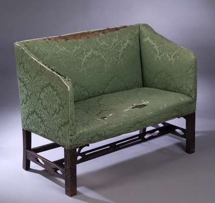 of small proportions, the upholstered back with sloping arms above upholstered seat on square legs with blind fretwork carving and with curved bracket supports, linked by pierced stretchers