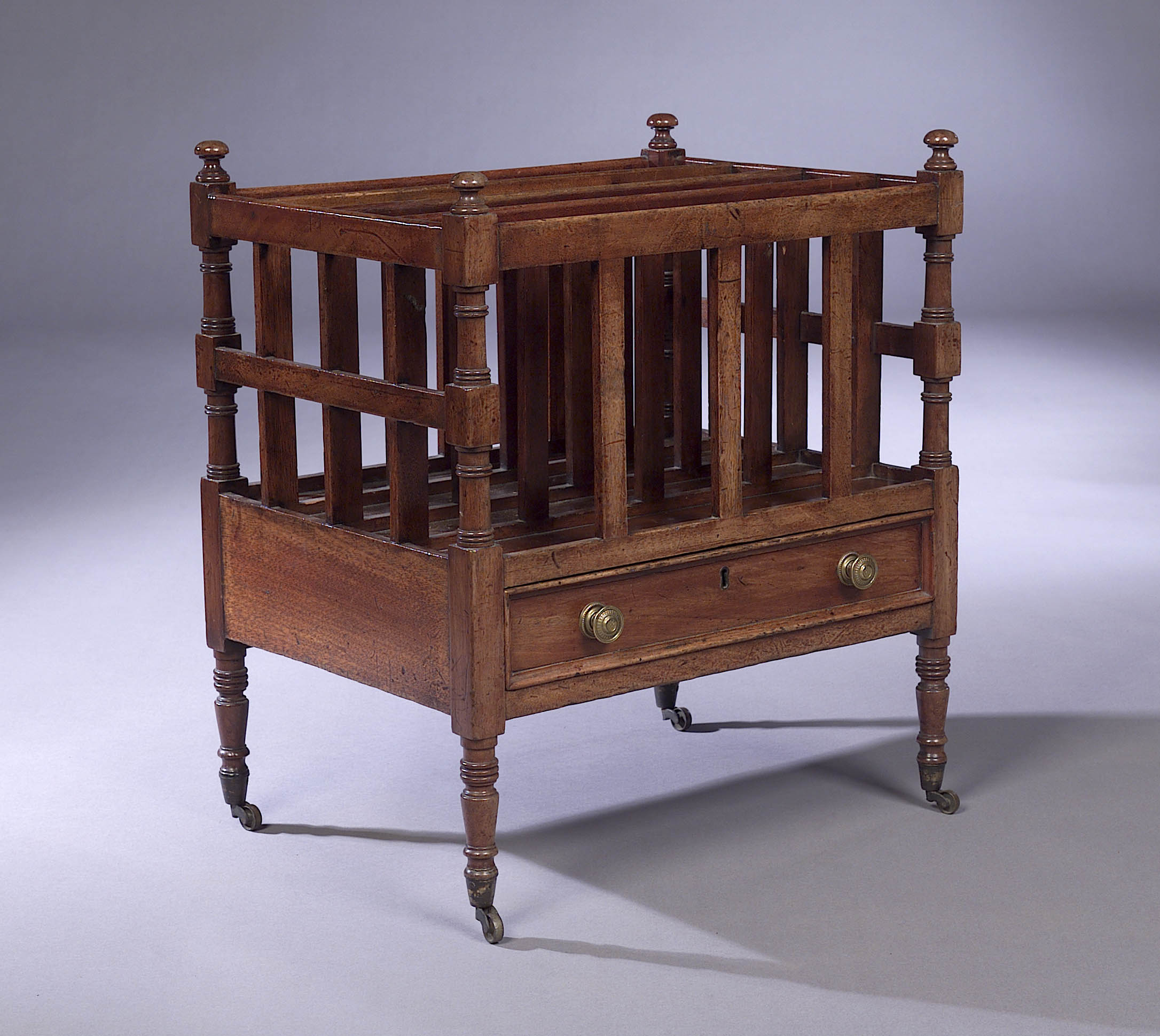 with four open compartments, turned and blocked corner uprights with finials, single drawer below, on turned tapering legs with brass caps and castors