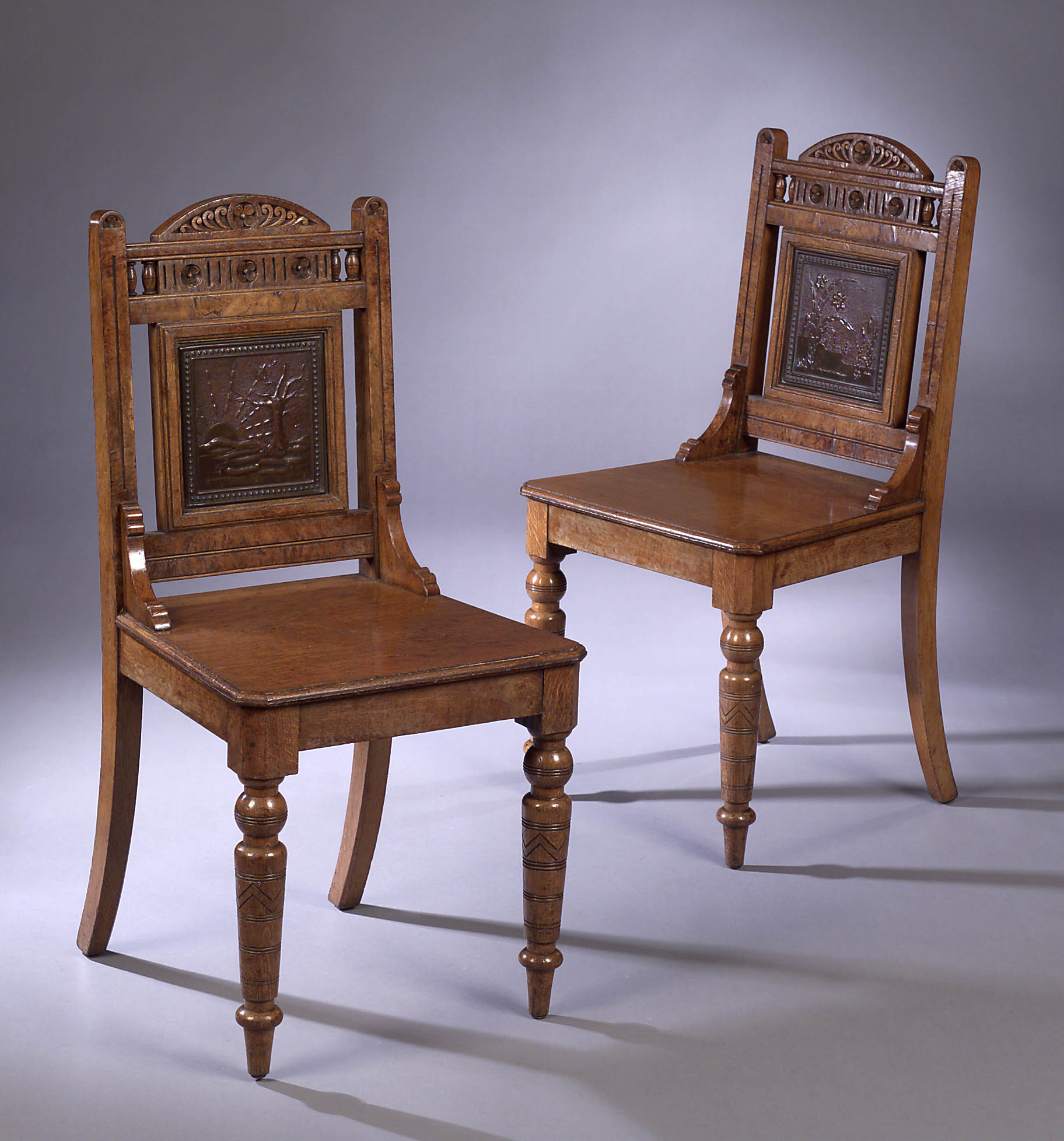 in the Aesthetic style, the leaf and rosette carved top rails above square copper panels embossed with plant forms and a landscape in the Japanese taste, the canted rectangular seats raised on turned and tapering front legs with incised serrated decoration (2)