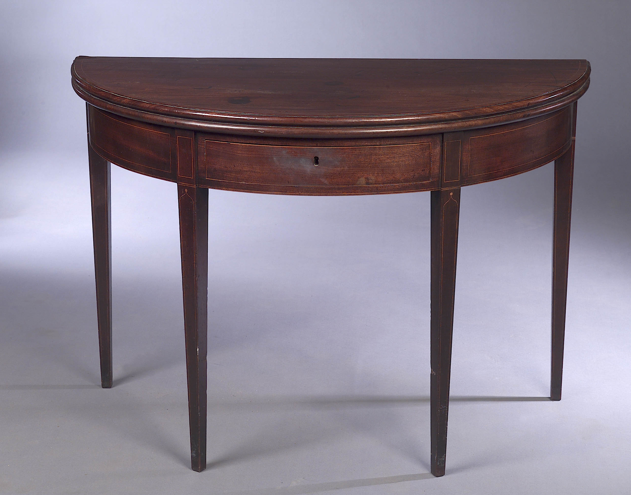 with boxwood stringing, the demi-lune top above frieze drawer raised on square section tapered legs with round dot ogee terminals