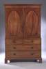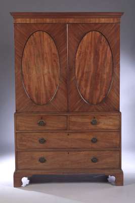 the moulded cornice above pair of doors with oval panels enclosing sliding trays, raised on base with two short and two long graduated drawers, on shaped bracket feet