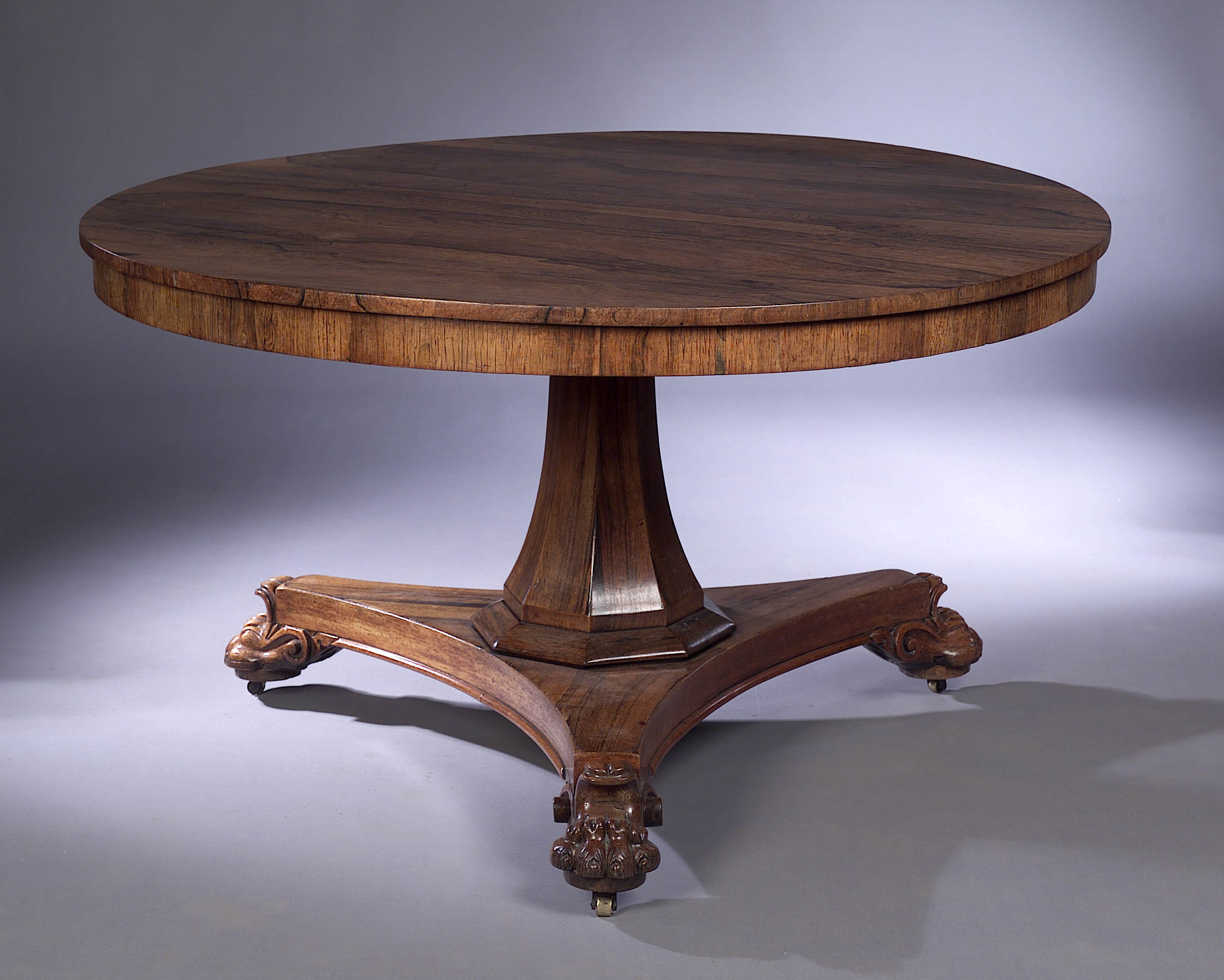 the circular tilt top with plain crossbanded frieze raised on octagonal spreading pedestal and concave triform base with carved scrolling paw feet and sunken castors