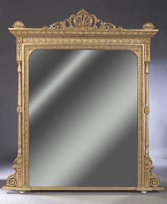 bearing label of A. Gardner and Son, Carvers, Gilders, Looking Glass and Picture Frame Manufacturers, Hackney Road, London, the rectangular plate with rounded angles with leaf cast frame with vine cast frieze and fluted and blocked flanking columns, moulded cornice with pierced acanthus cresting and fan terminals