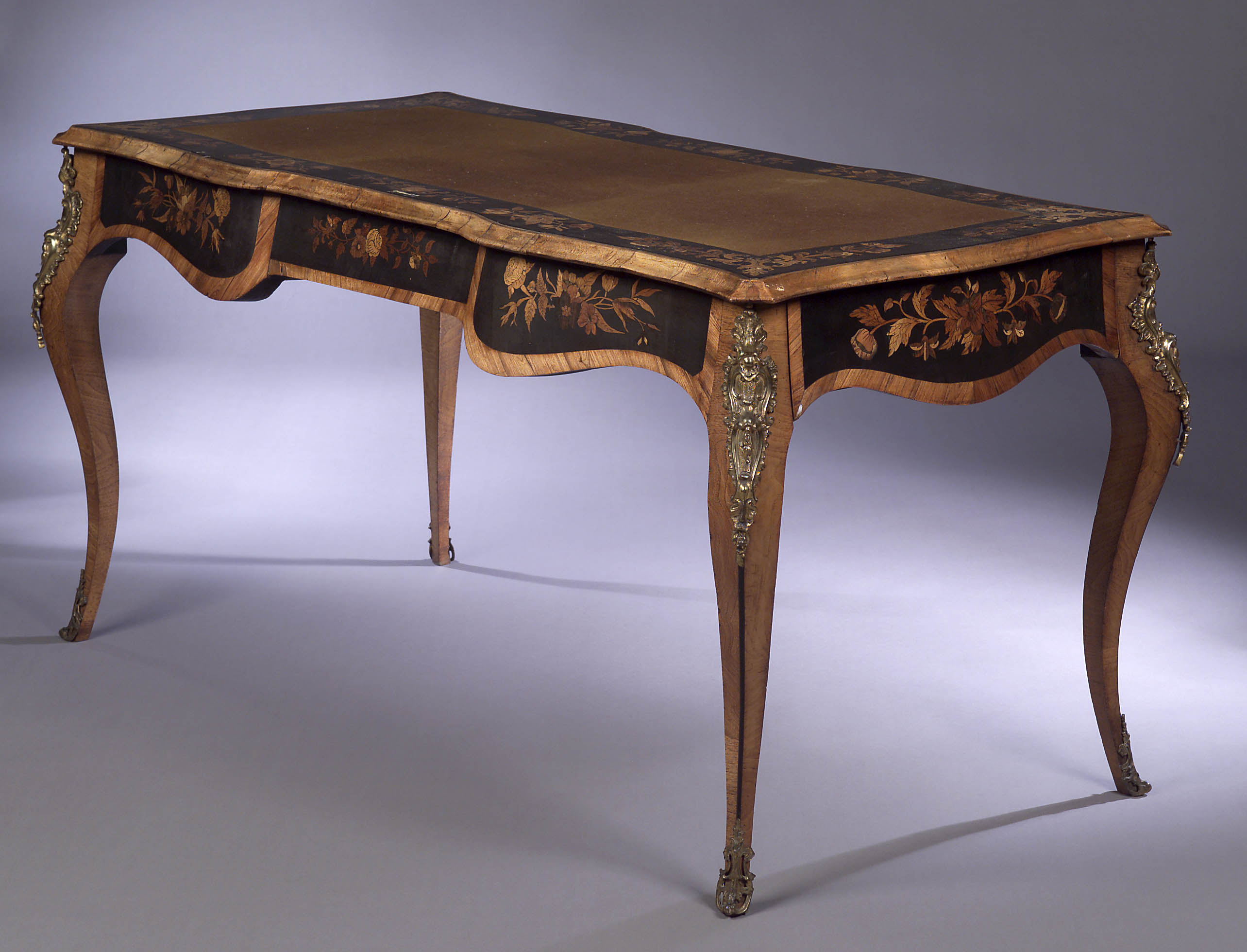 in the mid 18th century French style, the rectangular top with serpentine moulded outline enclosing an inset writing surface border by a band of marquetry inlaid floral sprays on a stained pearwood ground, above a serpentine fringe with similar marquetry panels and with opposing frieze drawers to the ends raised on square tapering cabriole legs with gilt-metal and C-scroll cartouches to the knees and terminating in cast sabots
