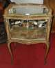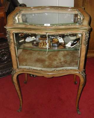 the shaped rectangular glazed top above four glazed panels enclosing a glass shelf on slender cabriole legs, the whole with foliate and scroll gilt metal mounts