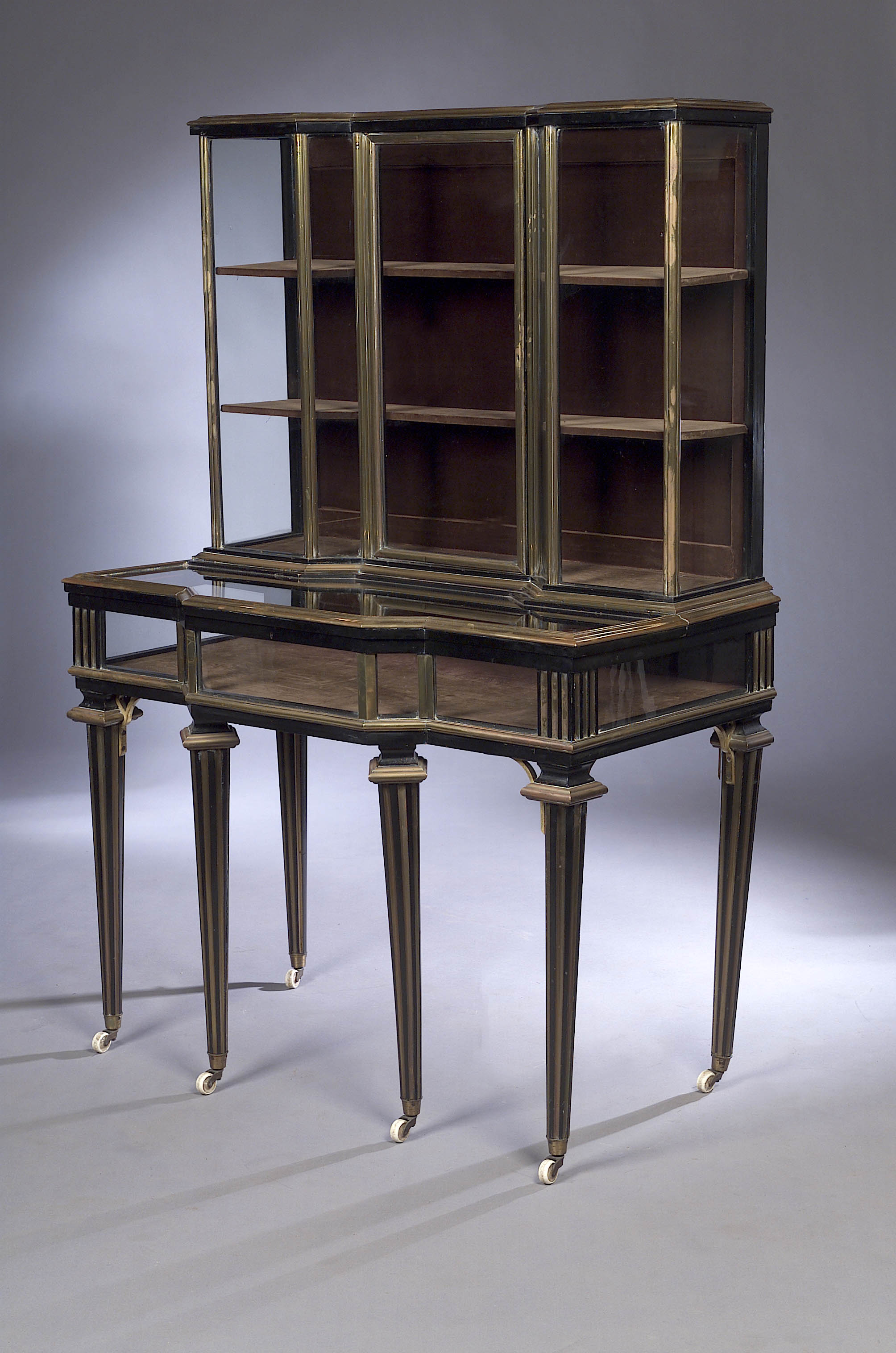the moulded and glazed top above reverse breakfront surmount, with glazed panels and central door enclosing shaped velvet covered shelves, the breakfront lift-up top, with glazed panel, enclosing a velvet lined display surface with glazed sides, the whole raised on turned and tapering legs with gilded fluting, pot castors