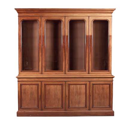 the projecting and moulded cornice above four glazed doors with arched mouldings, enclosing adjustable shelves, the base with moulded rim above four moulded panel doors, fitted with shelves and drawers and raised on a plinth