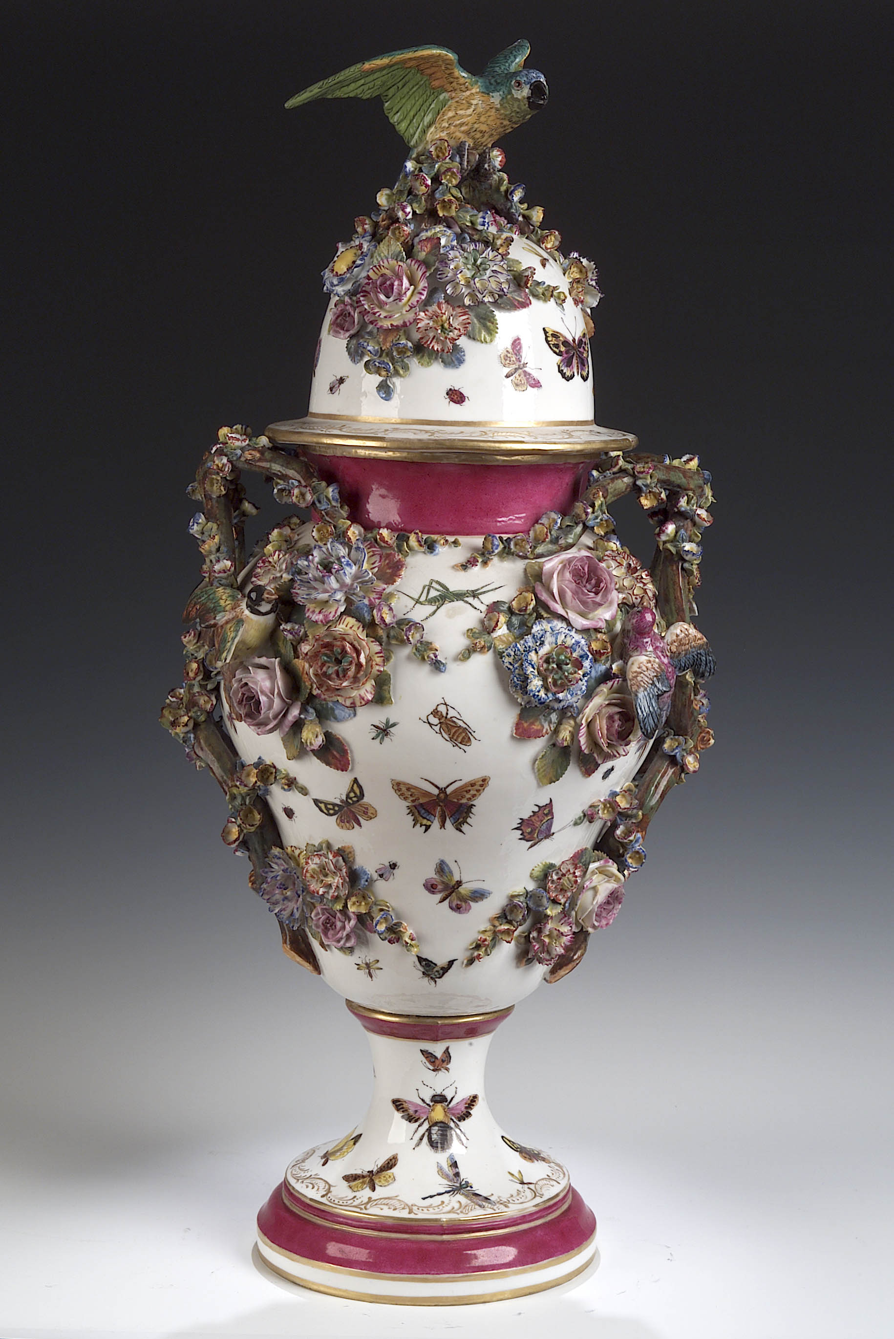 of Meissen style, with parrot alighting on a floral branch finial, the domed cover and twin handled baluster vase applied with birds amongst foliage and painted allover with butterflies and insects, on circular base