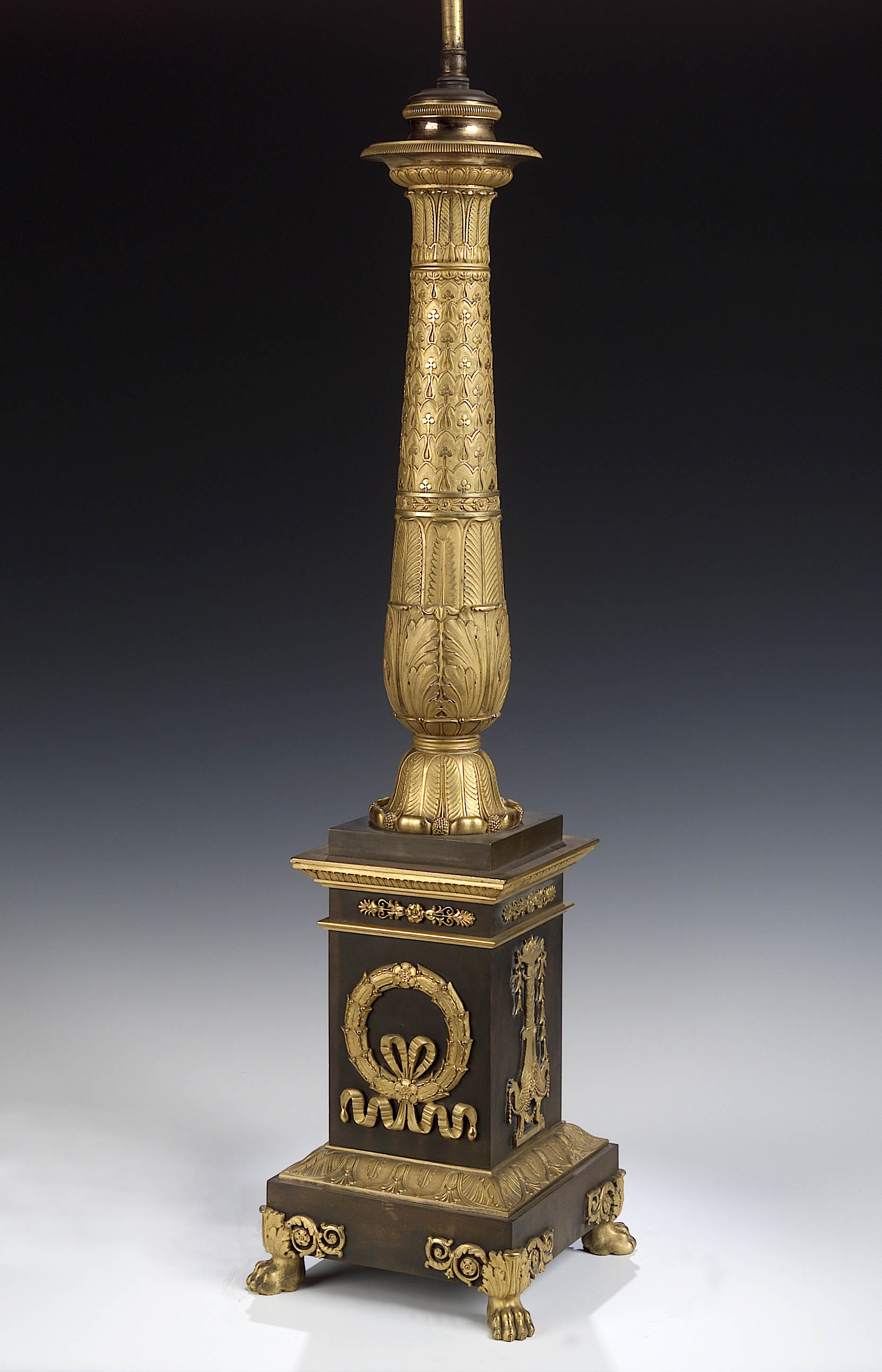 with four light fittings on baluster column cast with stiff leaf, trefoil and acanthus decoration on stepped rectangular plinth cast with wreaths and columns, on paw feet