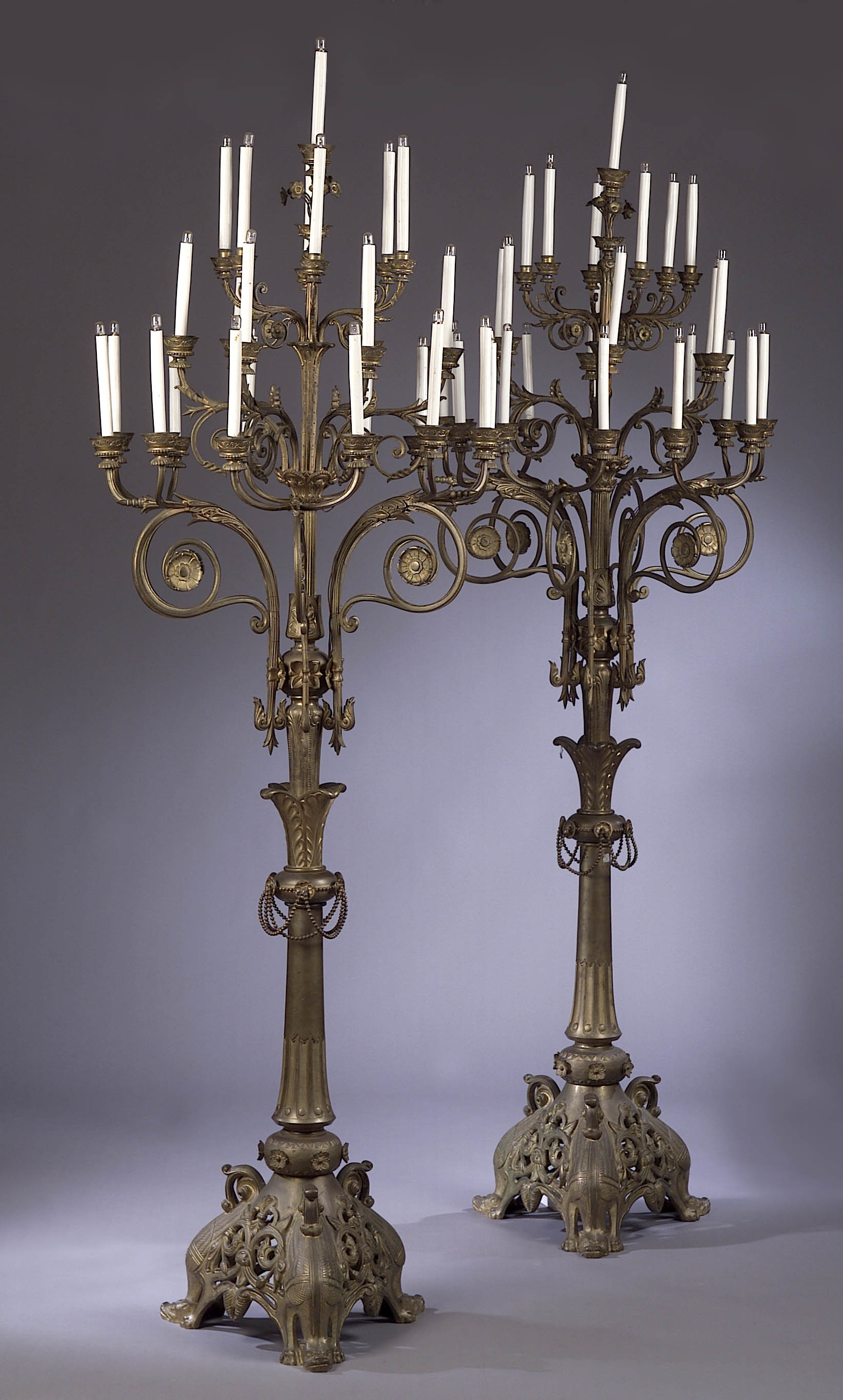 each with central floral cast candlebranch surrounded by twenty four graduated scrolling candlebranches, issuing from stiff leaf and beaded swag hung column, on pierced tripod base with legs and feet cast as winged mythical creatures (2)
