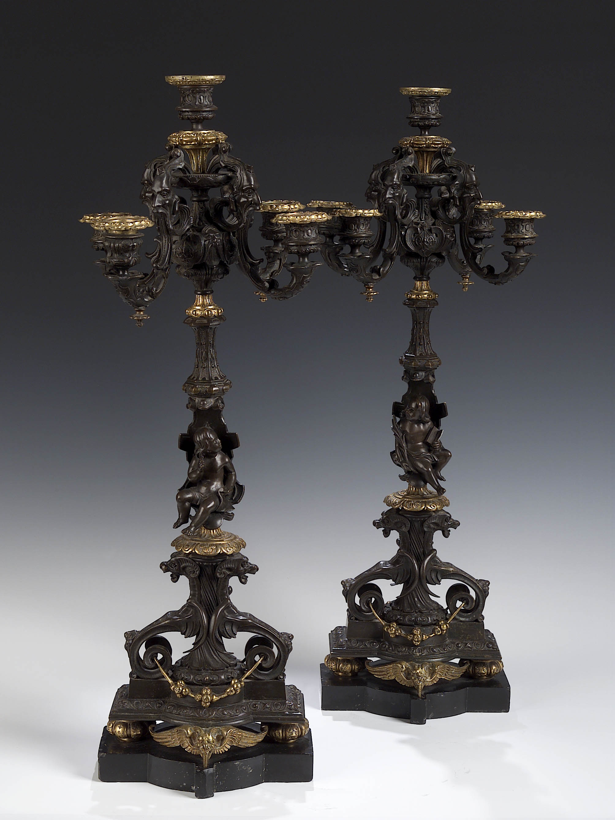 of Renaissance style, each with urn shaped socle above four grotesque scrolling candlebranches, on column cast with a seated cherub above two grotesque scrolling supports and gadrooned bun feet, on black marble plinth (2)