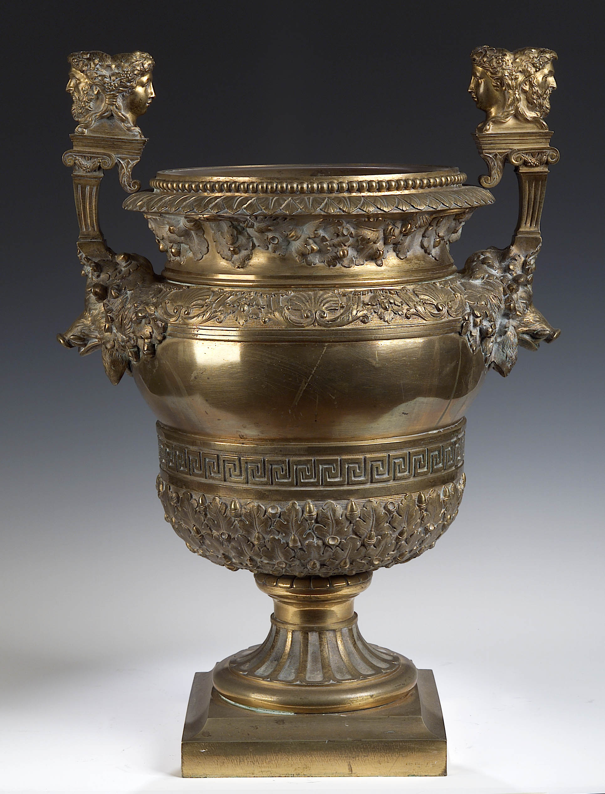 with two handles cast with double head finials, above boar's heads, the body with bands of oak, shell and Greek key decoration, on fluted foot and square base