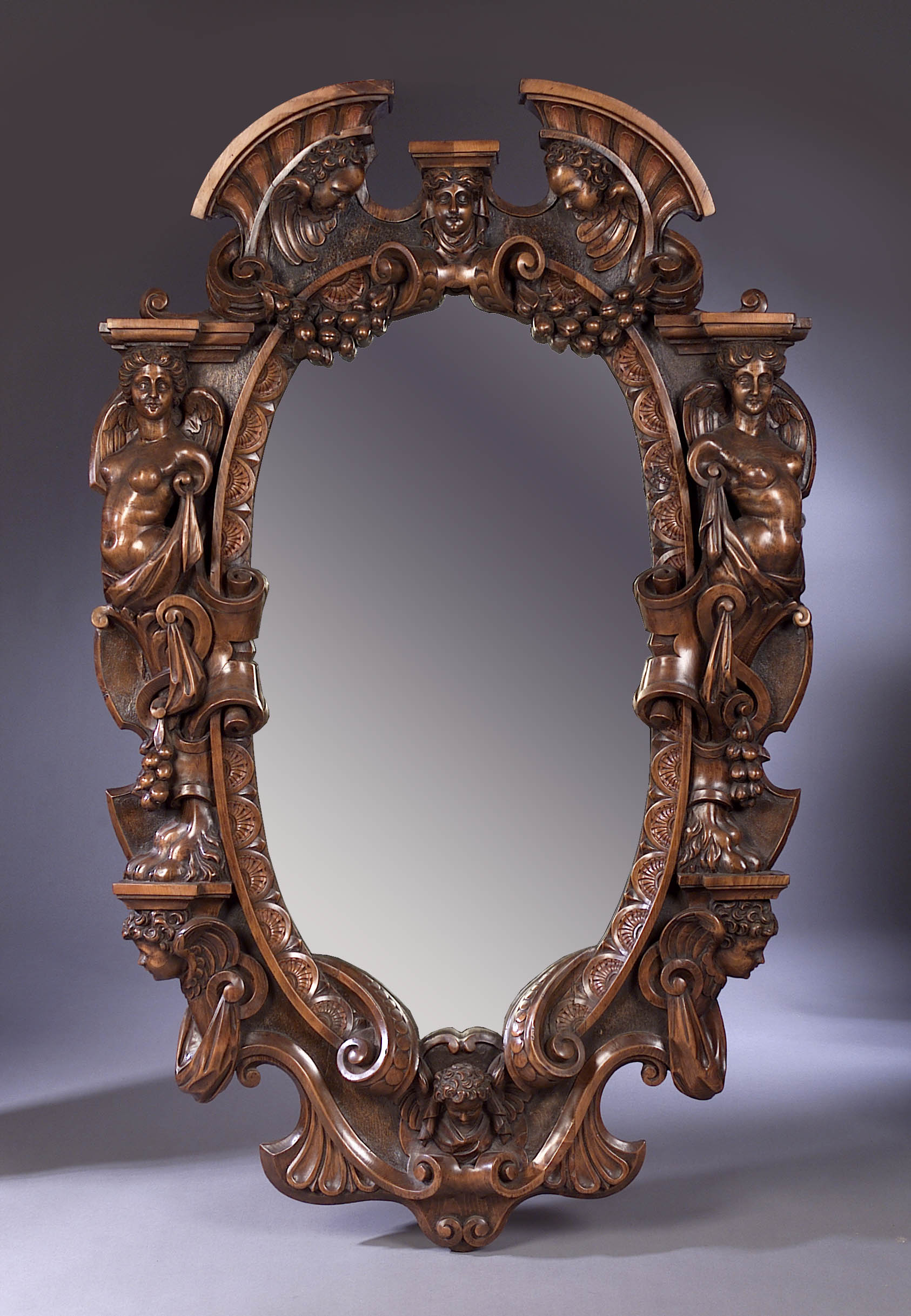of Renaissance style, the broken pediment carved with cherub heads flanking a female head and fruiting swags, the oval mirror plate flanked by carved caryatids, with further cherub heads below