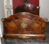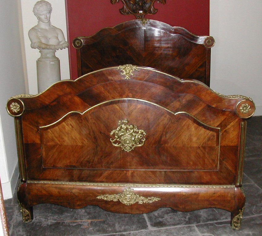 of Louis XV style, with arched scrolled head and footboards, the footboard with raised panel centred by a cast mount of a girl and boy on scrolled cartouche, the shaped apron centred by a cast mask, on short cabriole legs and acanthus cast sabots