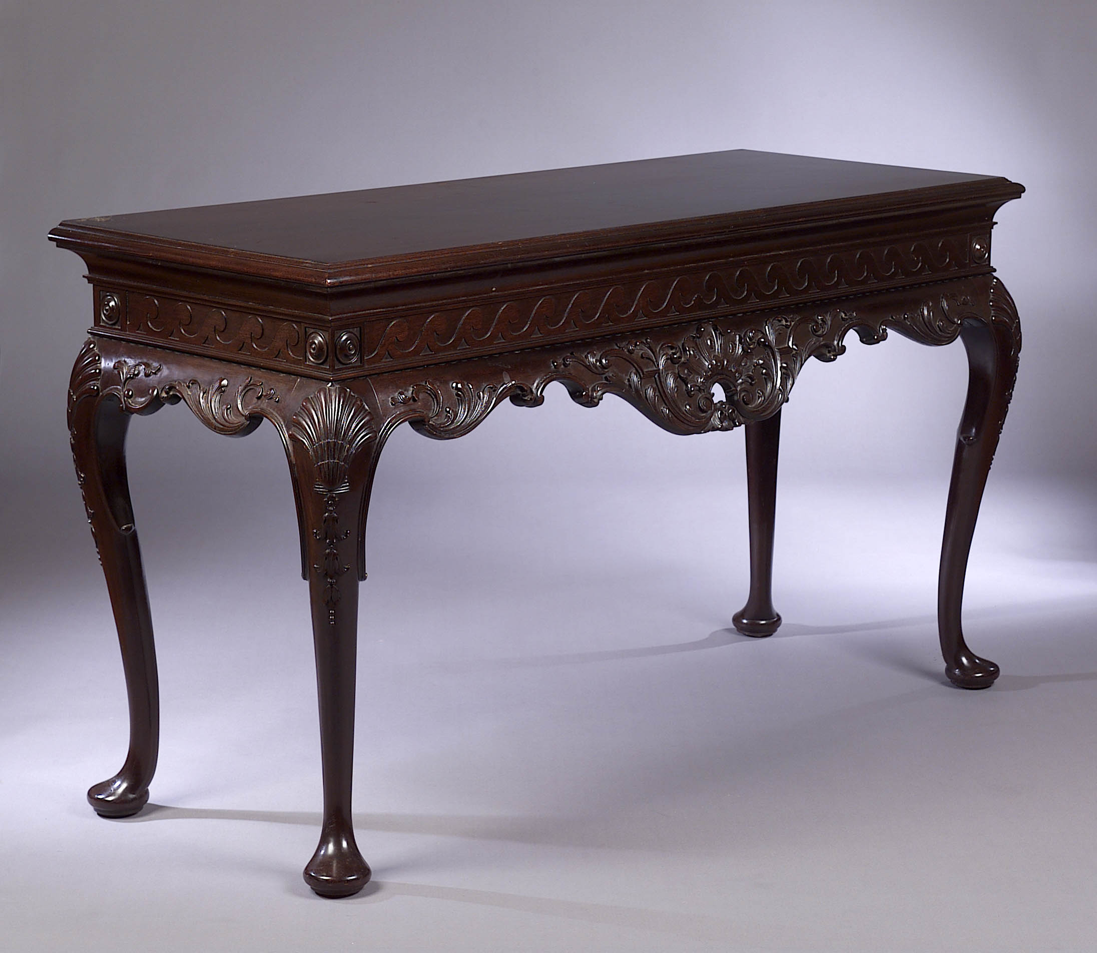 of George II style, the moulded rectangular top above a scrolling frieze and acanthus carved shaped apron centred by a pierced shell, on cabriole legs headed by carved shells suspending harebells, on pad feet