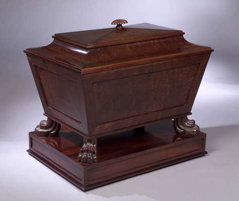 of sarcophagus form, the hinged lid with gadrooned finial, enclosing a fitted interior, on carved paw feet and rectangular plinth base, the lock stamped "D Cormack, Edinbro'"