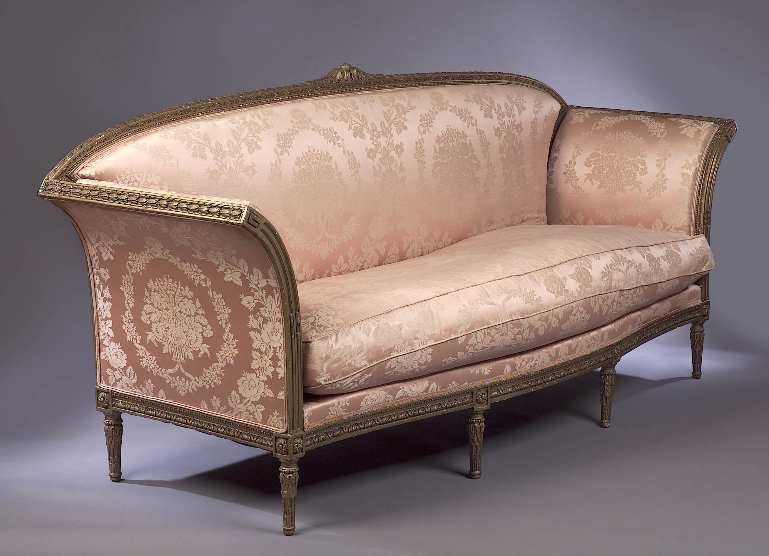 of Louis XVI style, the harebell carved frame, enclosing back, outscrolled arms and serpentine seat upholstered in pink damask fabric, on acanthus carved and fluted tapering legs