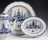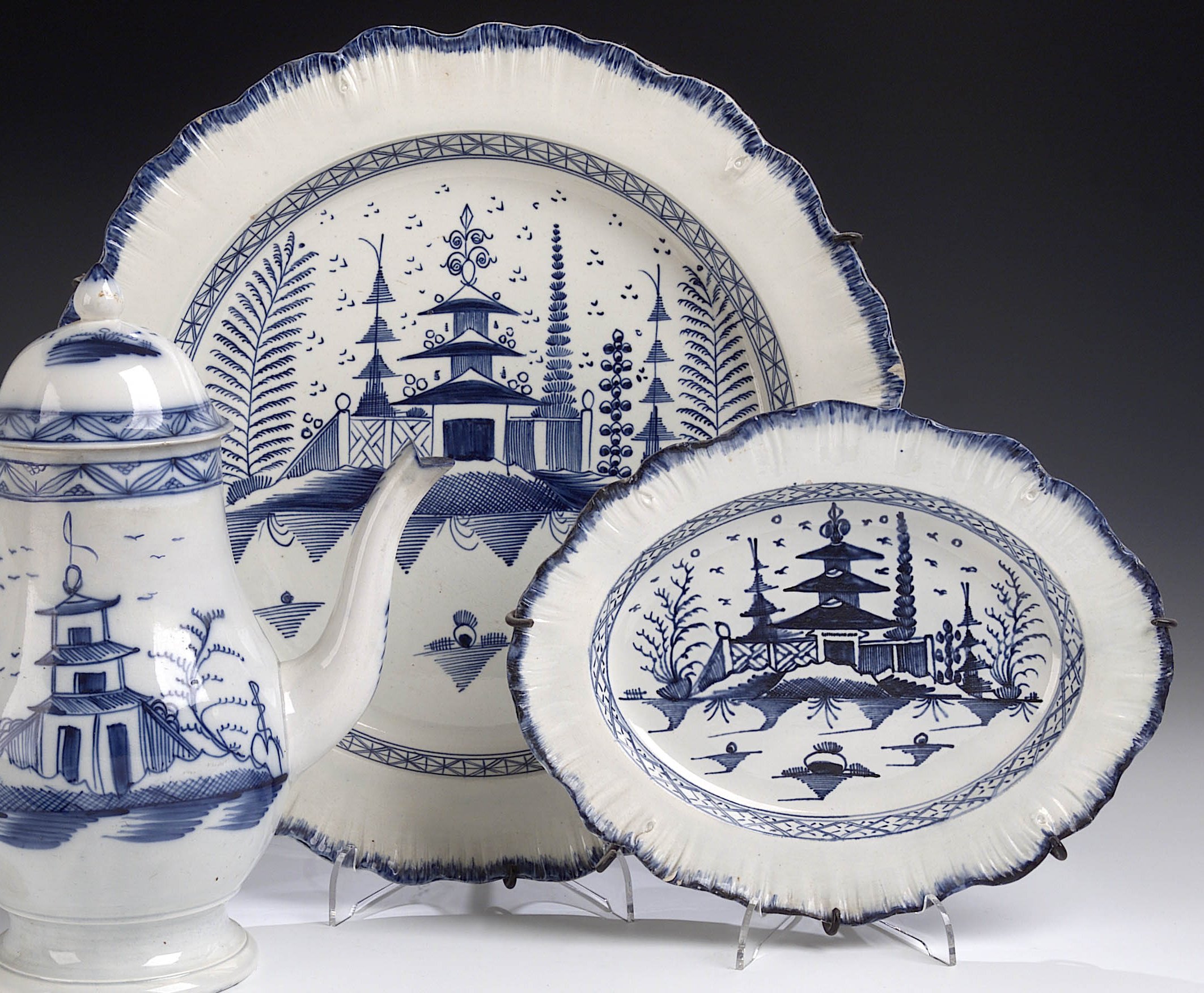 with central Chinoiserie landscape and pagoda panel, with narrow cellular frieze, 36cm diameter; also a small oval scalloped ashet of similar design (2)