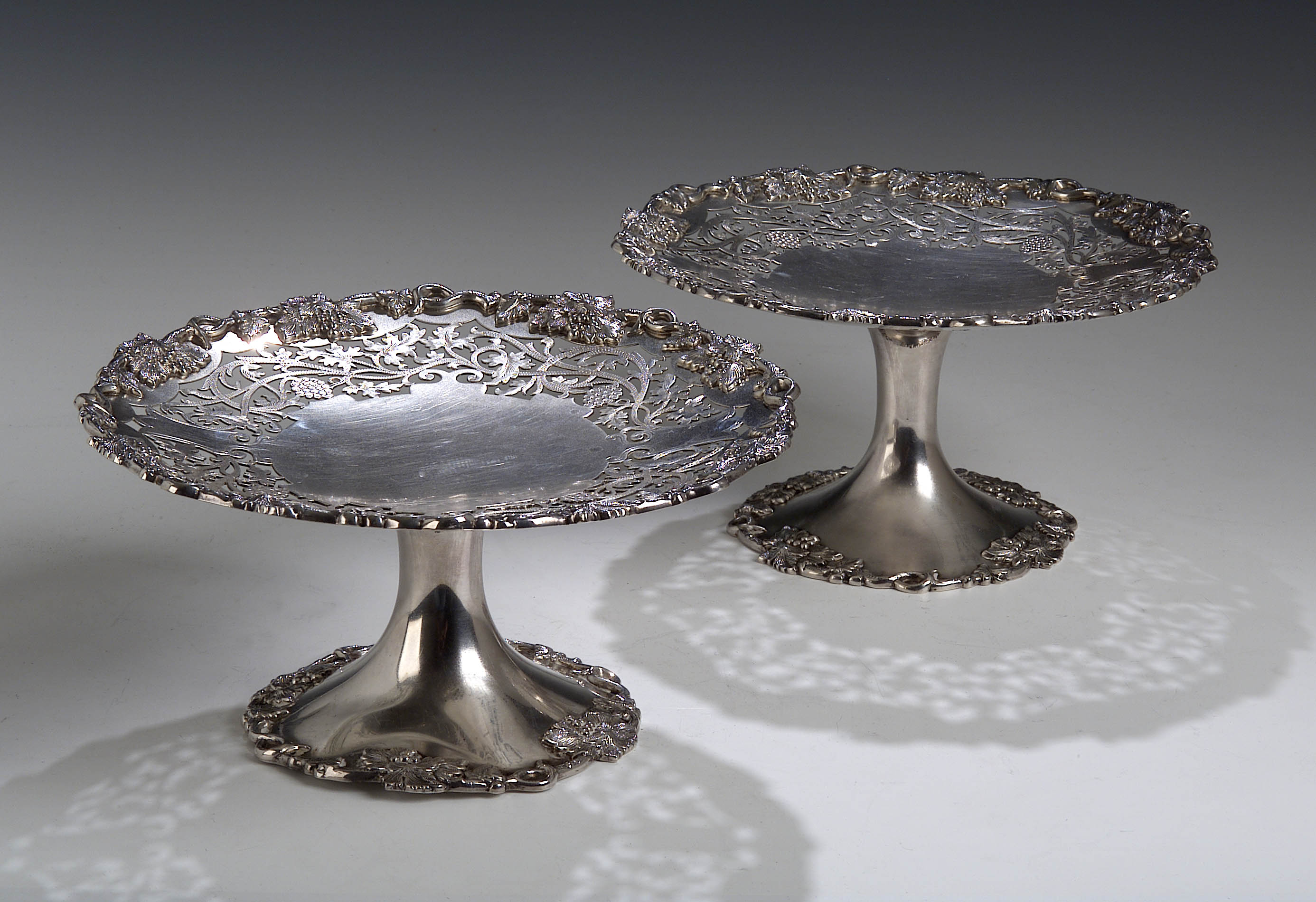 Sheffield 1928 and 1929, makers' marks for TL and Edward & Sons, circular form, cast fruiting vine border, pierced foliate scroll vine, each on a raised spread circular foot