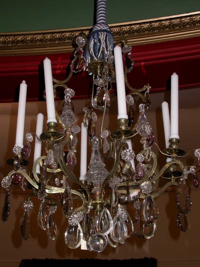 the scrolled frame with eight candle branches, the whole suspending variously shaped and some purple coloured glass pendants